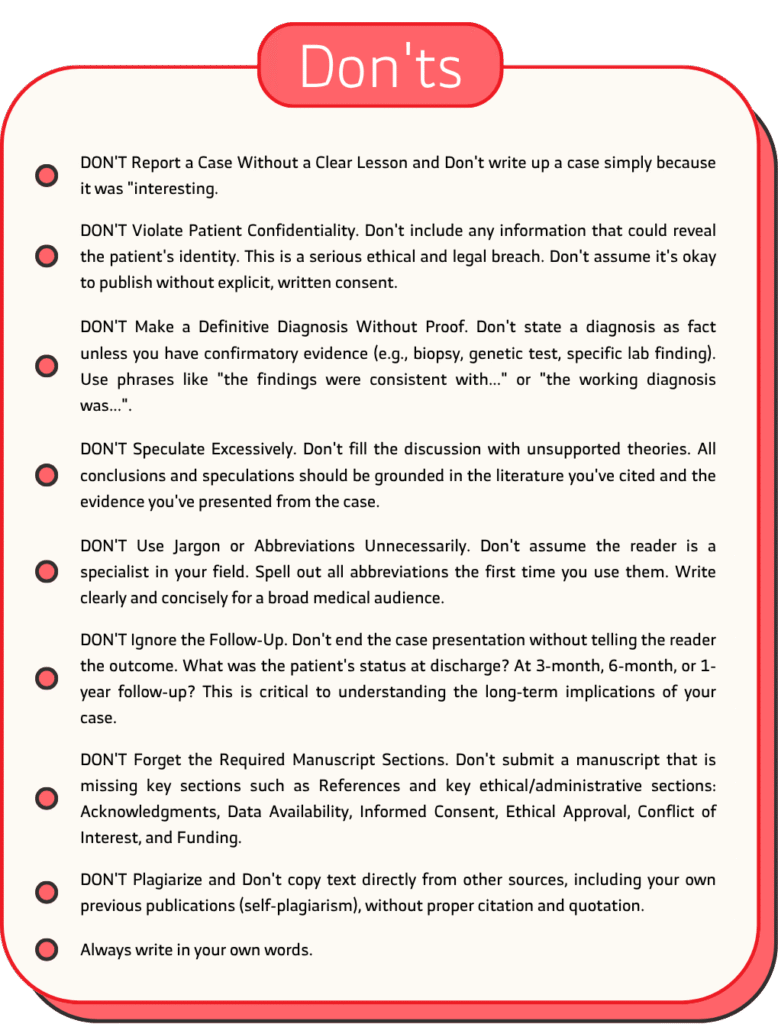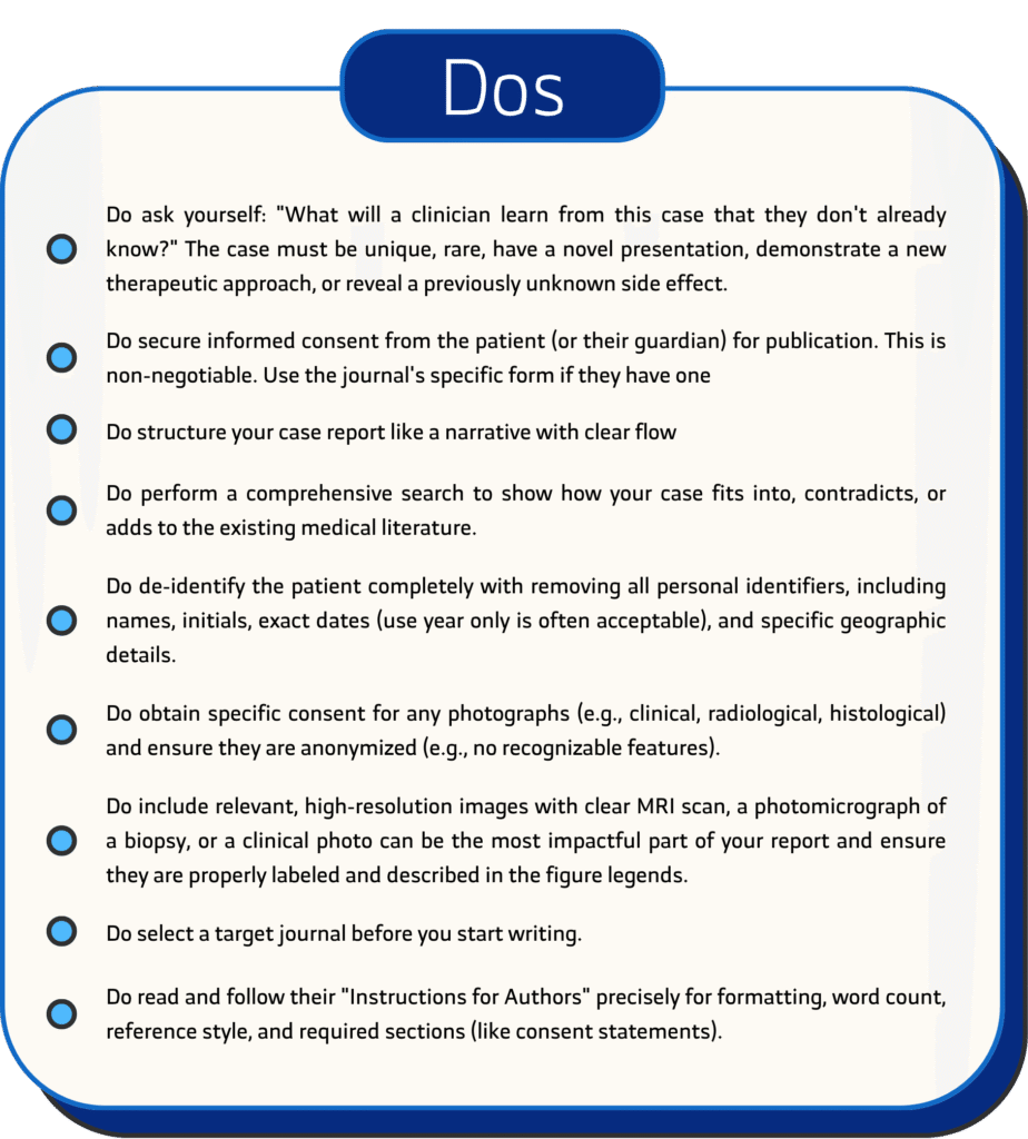Follow “Dos and Don’ts” is crucial for writing a compelling and publishable case report. Here is a list of Dos and Don’ts for a case report study, covering everything from conception to submission.