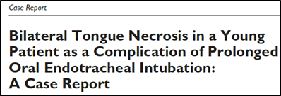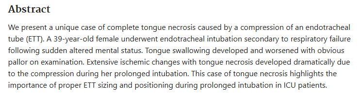 2. Present the case: `A 39-year-old female underwent endotracheal intubation secondary to respiratory failure following sudden altered mental status. Tongue swallowing developed and worsened with obvious pallor on examination. Extensive ischemic changes with tongue necrosis developed dramatically due to the compression during her prolonged intubation. `
